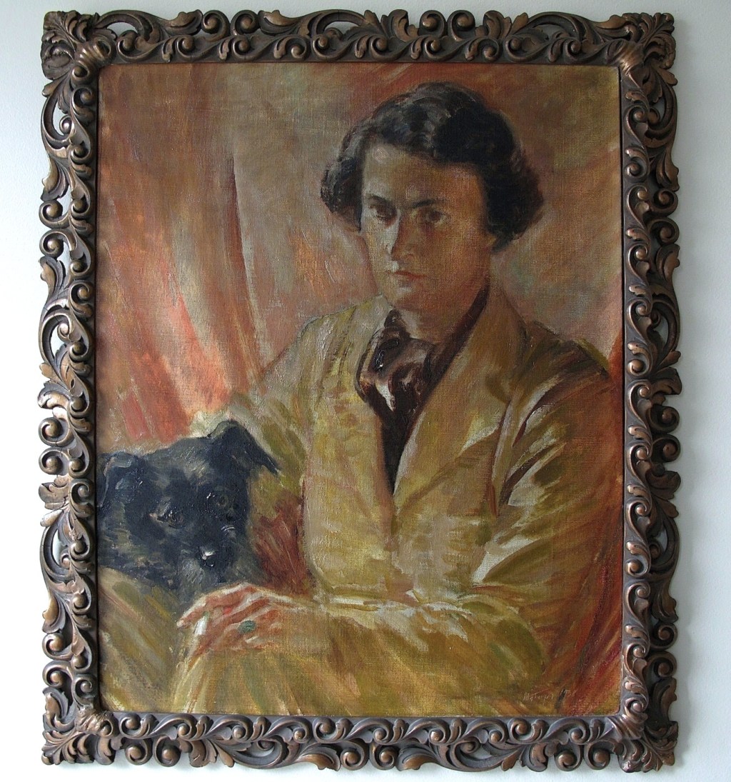 A pre-WWII portrait of a lady seated in period clothing with a small dog.  The painting is signed, but the name of the artist is hard to read.  The painter obviously had formal training, as the proportions and composition are well thought out.  It appears to have been created over several sittings, with many layers of paint present.  It’s a vibrant painting in both colour and subject. The plaster copper leaf frame is complimentary to several details within the painting.  The frame has a few small repairs to the plaster, which are blended in rather well and only noticeable with a close inspection. The frame measures 24″x31″.
