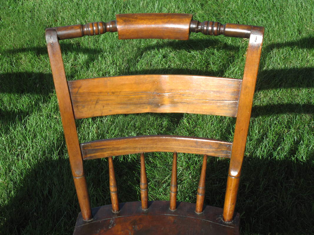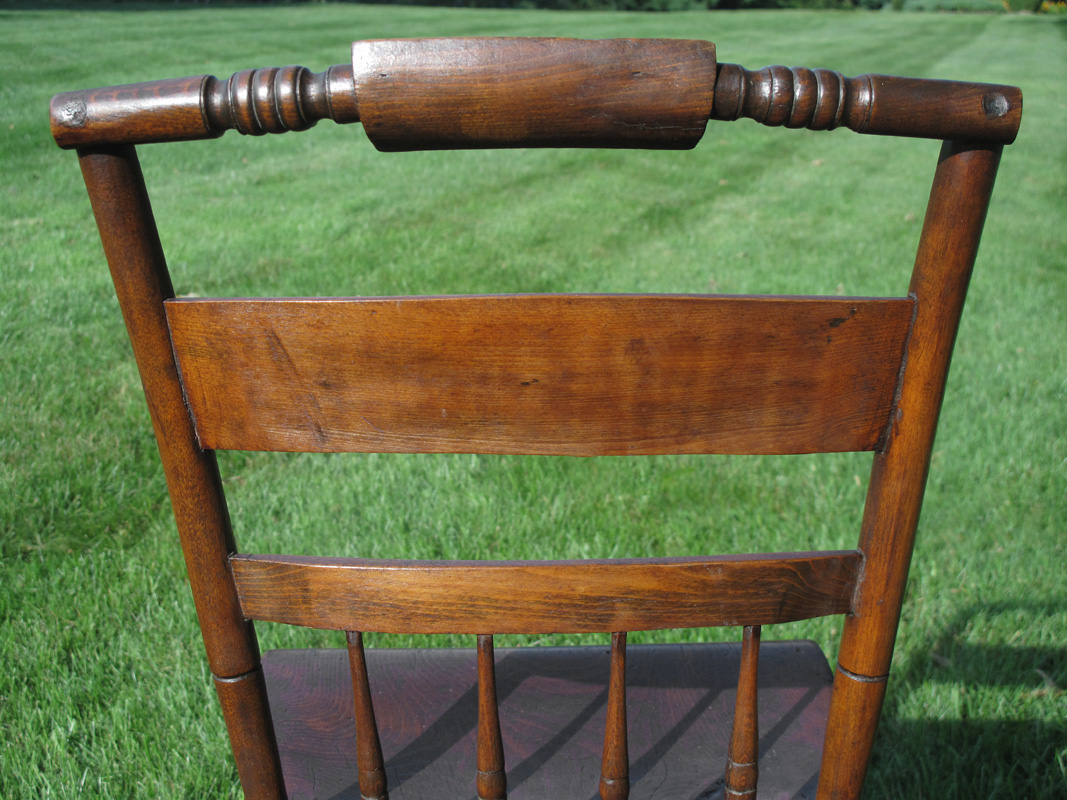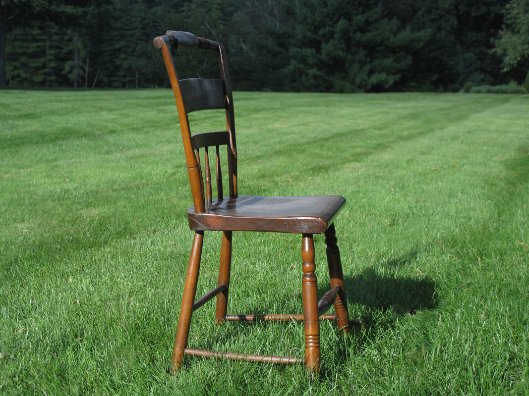 Most Hitchcock chairs are painted black, but these happened to be finished Yellow Pine & hardwood. Under one of the chairs, there is very faint painted lettering, showing to whom the chairs were made. I haven’t been able to make out the entire name. The chairs came from a farmhouse in Western Massachusetts and were likely made locally, with some parts potentially from the Hitchcock Co.  In 1818, the Hitchcock company started in the business of selling chair parts.