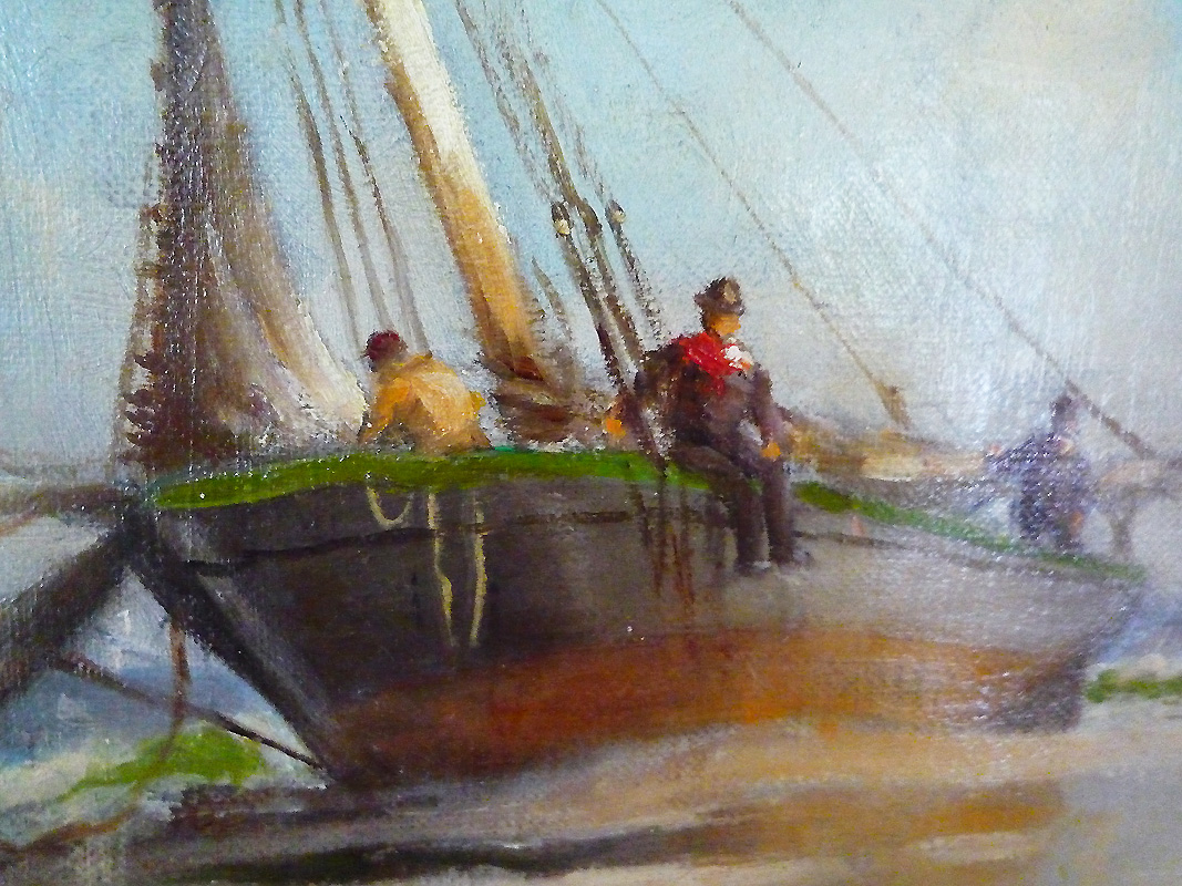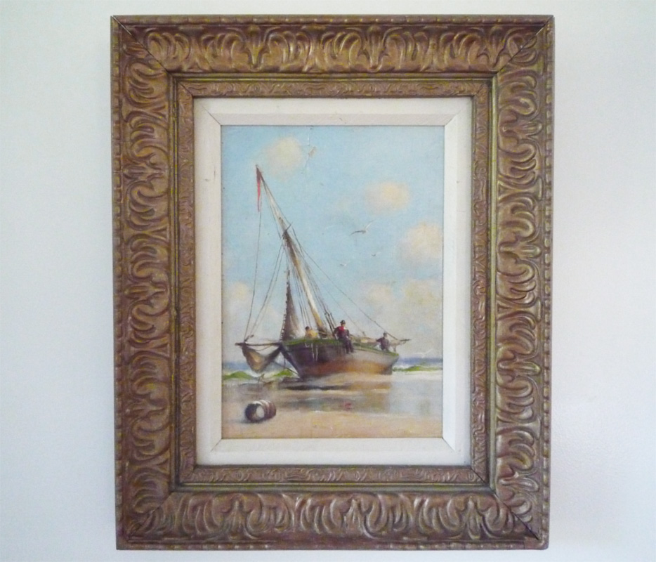 Offering a lovely painting of a sailboat at the shore in Boston. Painted by a well trained artist, as displayed by technique, composition and colour. There appears to be a crew of three individuals. The details are finely painted and the use of colours are sharp and brilliant. It’s a rather old painting with a bit of paint chipping at the very top. Overall the painting is well preserved and clean. The details about the painting are present on the back of the painting, with a title, name of artist and location. The lettering is likely original to the painting and appear to be written in an old hand.