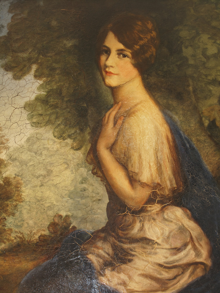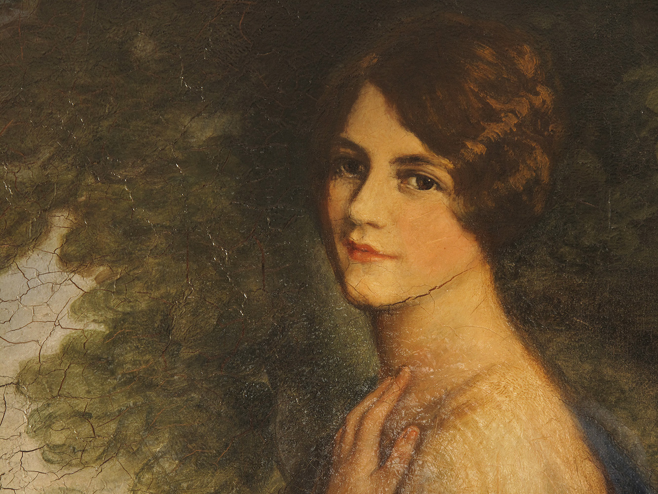 Offering a beautifully painted portrait of a young lady in a seated pose, with Classical styled clothing. The style has it’s roots in the 19th Century Pre-Raphaelite Brotherhood. There are several features, which indicate Pre-Raphaelite elements and overall feel. The composition and colours are exceptional. A very well painted portrait, with fantastic detail. The painting is nearly scaled to life-size, therefore the painting is rather large.