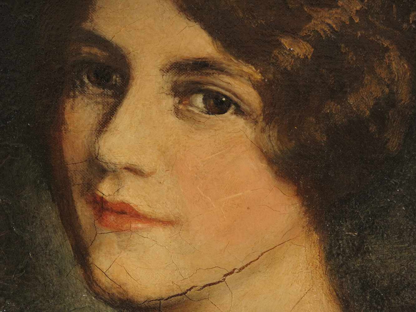 There are many fine cracks and puckers in the painting, but no missing paint or fading. Vibrant colour and details make it timeless. The paint seems to be firmly affixed to the high quality canvas. The painting hung over an old New England fireplace mantle, hence the distressed texture to the paint surface.