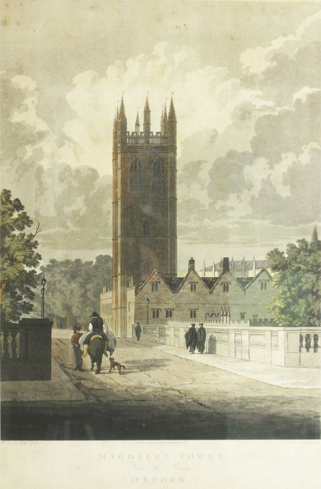Aquatint Engraving of Magdalen Tower, From The Bridge, Oxford, Printed in 1802, Very Good Condition, Large Original Engraving