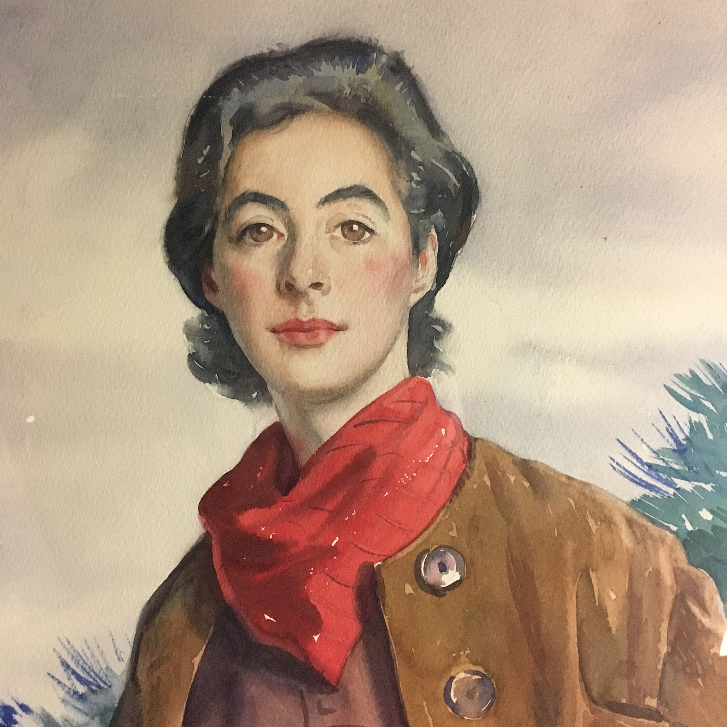 Large portrait painting by Aiden Lassell Ripley (American, 1896-1969) of Lexington, Massachusetts. Untitled. Watercolour signed and dated 1935. The portrait painting displays an attractive young lady in outdoor or riding attire. It has not been examined outside the frame, but it’s possible there’s a name or title on the rear. This painting was acquired in Western Massachusetts, so it’s likely the background scenery is of the Berkshires. Painted in late autumn or winter of 1935. The colours are vibrant for a watercolour of this age, with no age related issues. Fantastic details and composition. No damage to the watercolour. The mat has some spotting and a small light stain on the bottom right side corner. The portrait is framed in a large intricate gilded frame. Some minor water damage to the plaster of the gilded frame along the bottom portion, with a few small pieces of missing plaster. The portrait painting can hang as it is, or the watercolour can be re-matted and the gilded frame repaired.